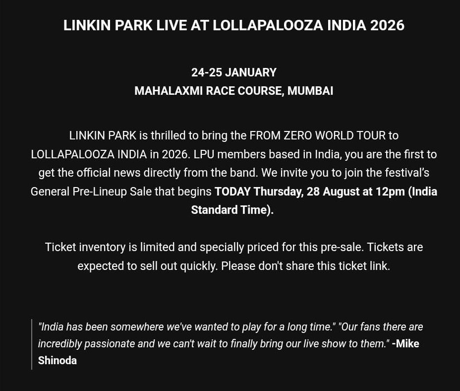 So, in summary, Linkin Park IS performing in Mumbai in 2026! Make sure you’re first in queue when Lolla India general admission tickets release tomorrow because those tickets will fly out. And who wants a repeat of the Coldplay India tickets meltdown?